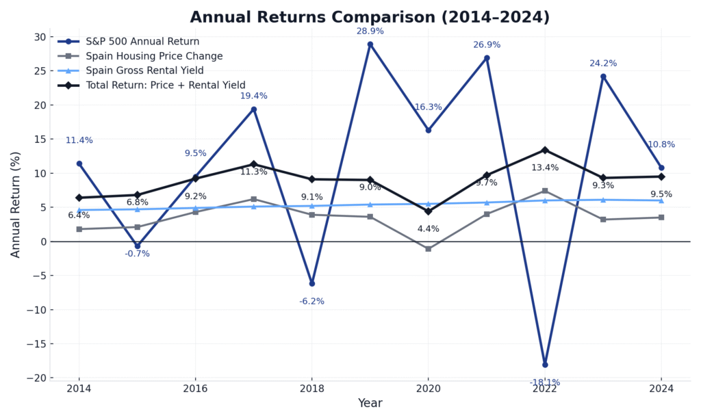 Diversifying your portfolio isn’t just a matter of reducing risk. Equity markets like the S&P 500 may offer strong average yields, but they are subject to high volatility. In contrast, real estate provides a more stable foundation, especially when approached through multiple complementary strategies.